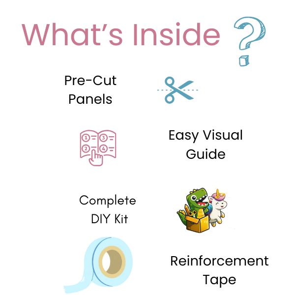 This D’bebé DIY animal costume set includes pre-cut, pre-folded cardboard parts for both unicorn and dinosaur designs, plus stickers and tape so kids can build without scissors or glue.