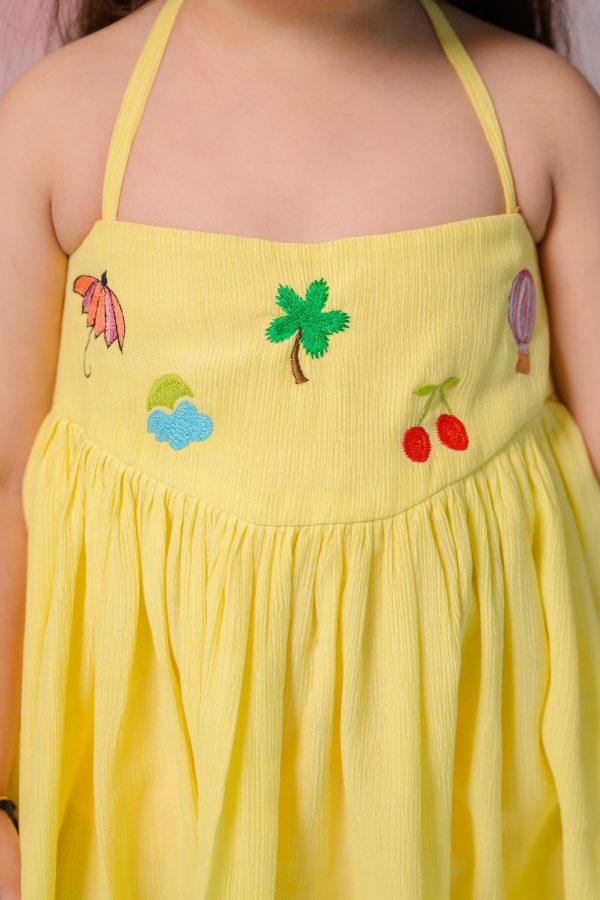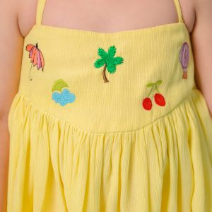 Crafted in soft crushed fabric, it carries a natural texture that feels light, breezy, and perfect for warm weather. The delicate beachy motif embroidery adds a whimsical charm, bringing together elements of fun, color, and coastal ease. Designed in an effortless loose fit, the silhouette allows for free movement and all-day comfort — ideal for vacations, outings, and carefree days in the sun. Blending casual ease with a lively, vacation-ready spirit, the Lemon Cherry Dress is made for moments that feel bright, joyful, and endlessly refreshing. 🍋🍒✨