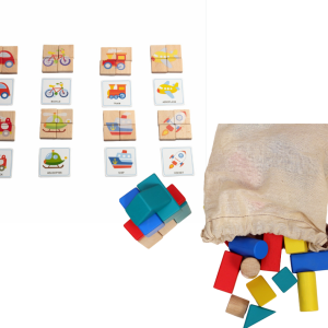 32-piece Puzzle Collection – featuring beautifully illustrated wooden puzzles of Fruits, Vegetables, Animals, and Vehicles, each paired with matching flashcards to encourage word recognition and early learning.