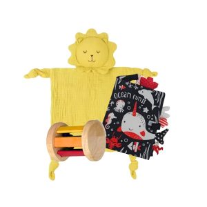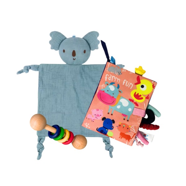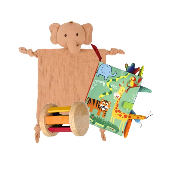 The most complete newborn bundle by D’bébé — includes one handcrafted wooden rattle, one soft cloth book, and one muslin snuggle toy of your choice (Elephant, Koala, Bunny or Lion).