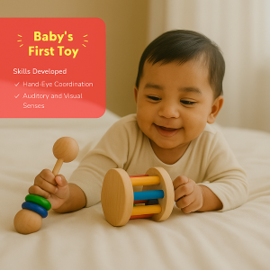 A beautifully handcrafted Wooden Roller Rattle designed to roll smoothly while creating a soft, soothing wooden chime. This elegant piece strengthens grip, builds hand–eye coordination, and nurtures rhythm and sound awareness through gentle motion. Thoughtfully created for early discovery, it’s a calming companion that supports mindful movement and focus — a meaningful addition to any Newborn Gift Box for babies aged 0–11 months.