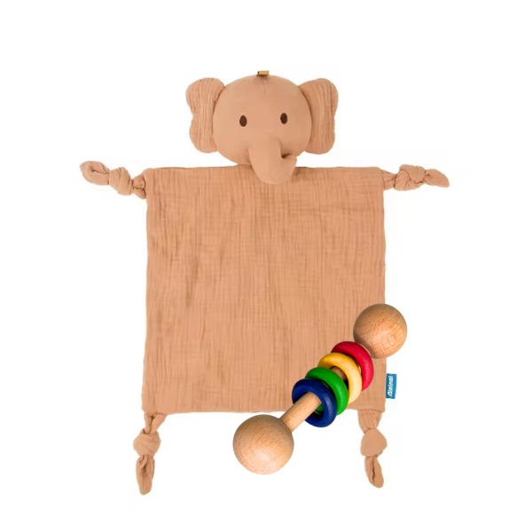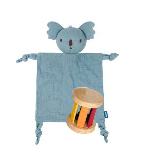 A cuddly sensory set made for the tiniest hands and biggest hearts — includes one handcrafted wooden rattle (randomly selected) and one soft muslin snuggle toy of your choice (Elephant, Koala, Bunny or Lion).