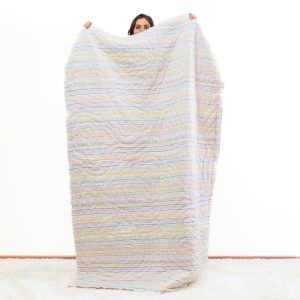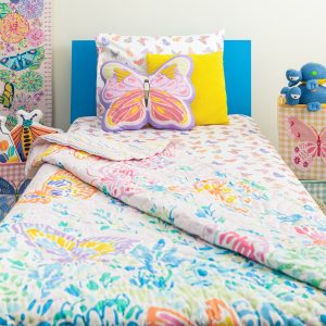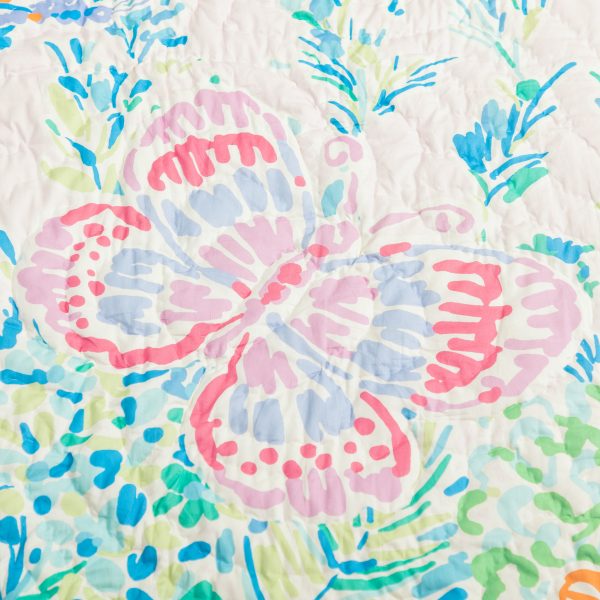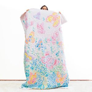This cotton quilt blanket safekeeps all things pretty. Its pastel landscape and visuals of flight lead into gentle slumber.