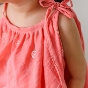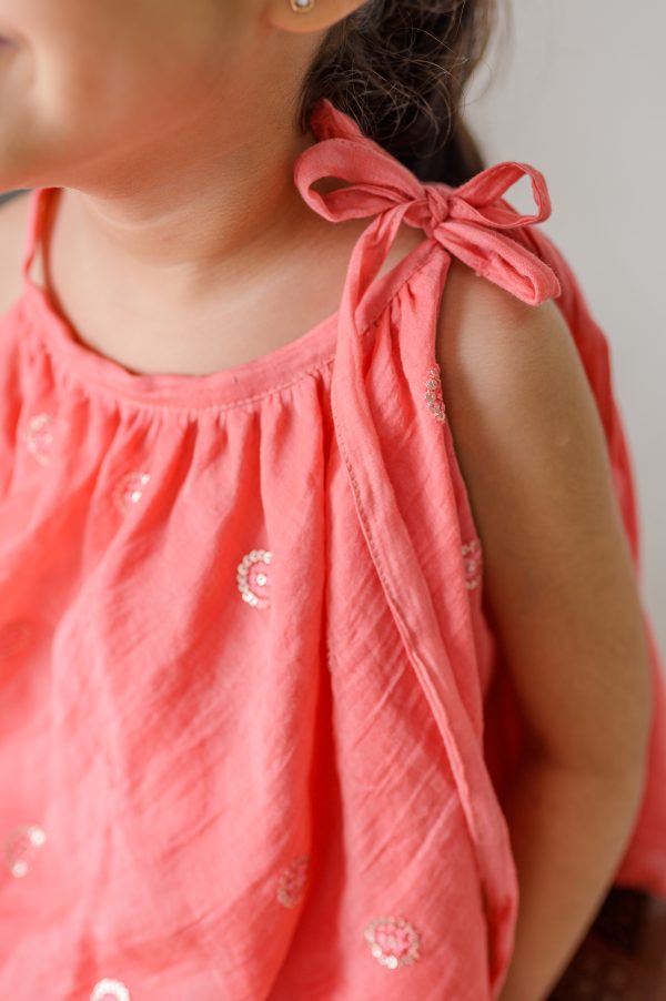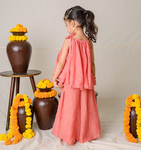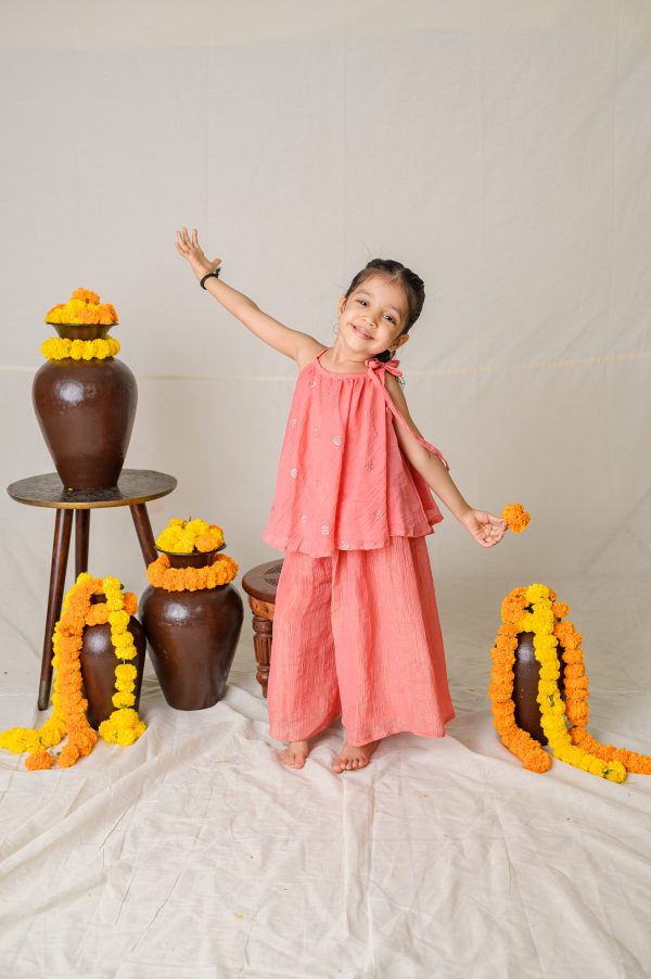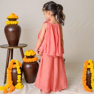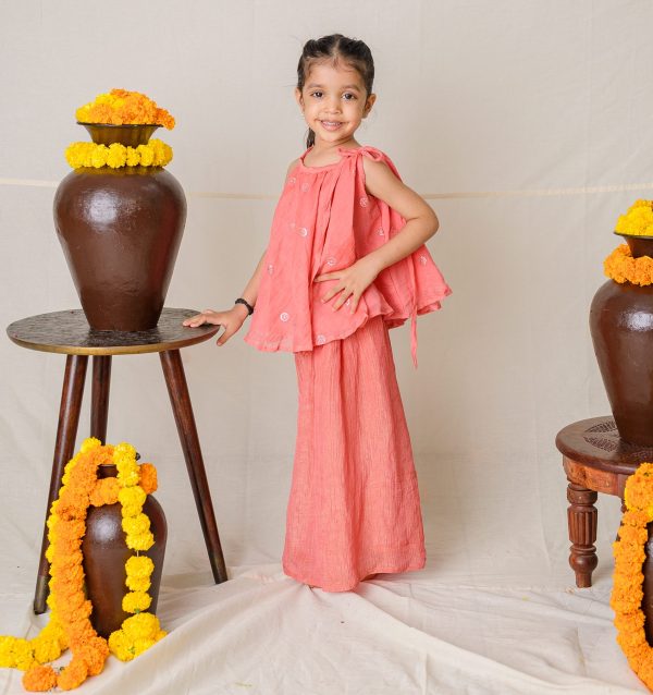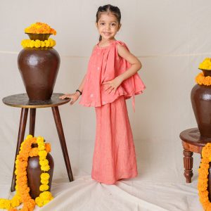 Crafted in breathable mul chanderi, this outfit captures the charm of childhood with its dreamy rose-pink hue and delicate embroidered flowers on the top.