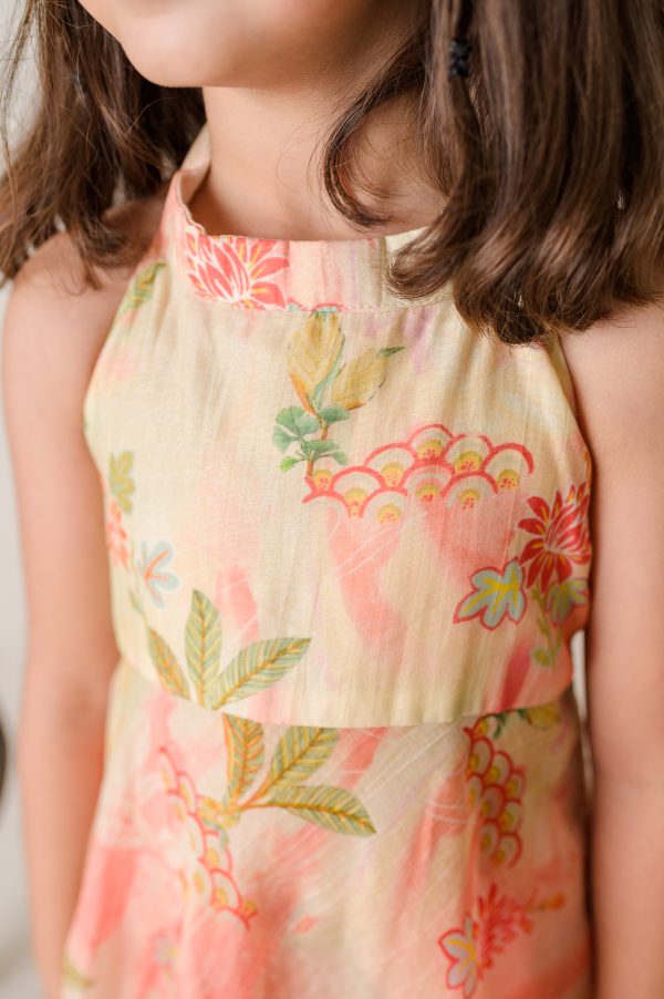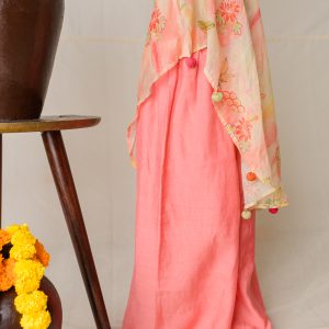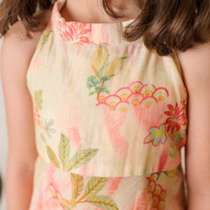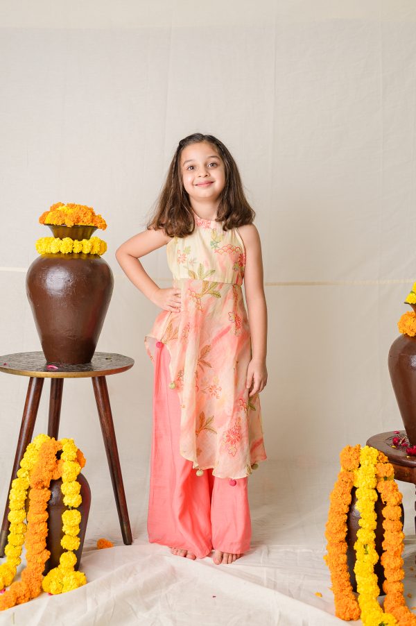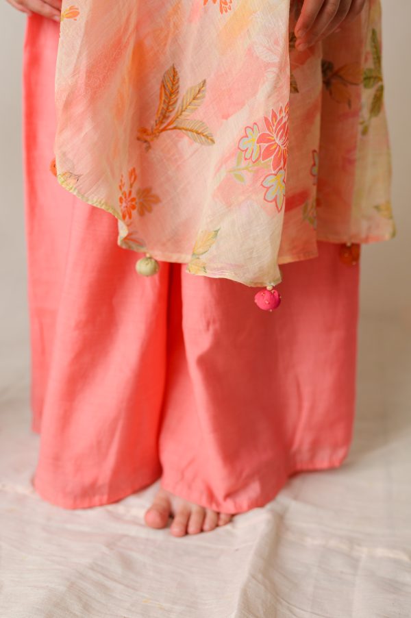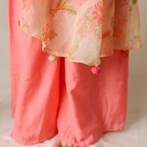 Made from soft, breathable mul chanderi, this high-neck kurta is sprinkled with tiny embroidered fabric balls—just like little bursts of