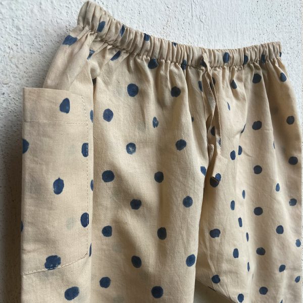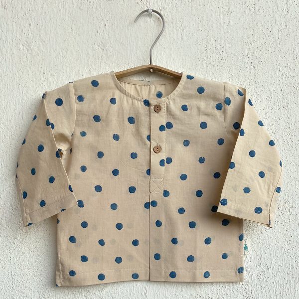 Part of our Zoo Treat collection, this 100% organic cotton set contains a hand block printed polka kurta top and matching pants created by traditional Ajrakh artisans in naturally hypoallergenic indigo colour. Wooden button closures and flat seams for ease of wearing and fit.