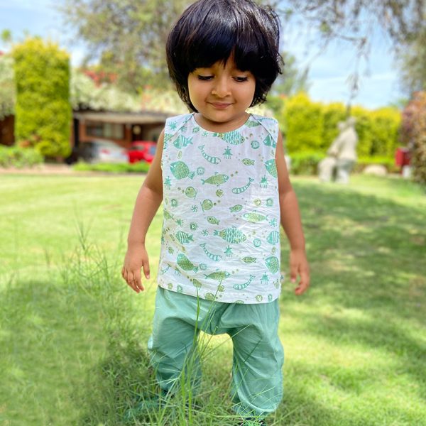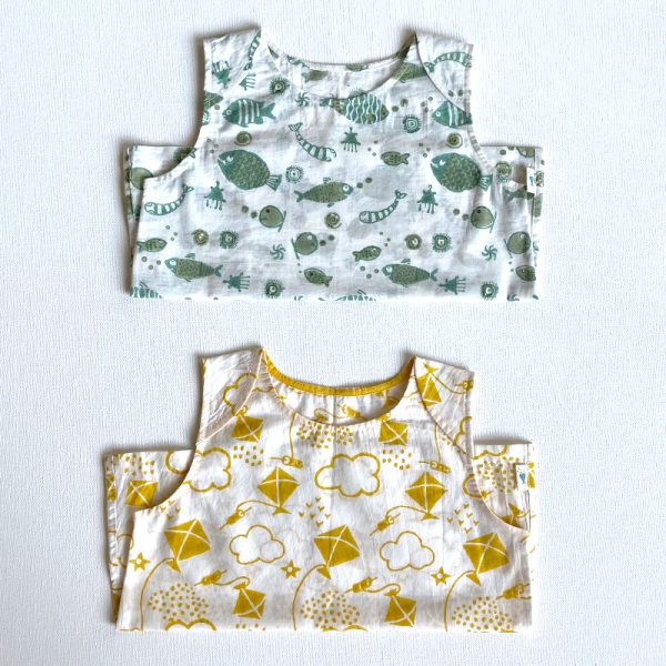 Set contains: 2 x jhabla tops: 100% organic cotton sleeveless tops with envelope neck for hassle-free wearing. All-over handblock printed patang or kite design in the colour of sunshine is accompanied by fishes in cool mint. Part of our Little Koi wants to fly poem collection. Conscious of minimising waste, the set is packed in a reusable muslin bag, ready for gifting.