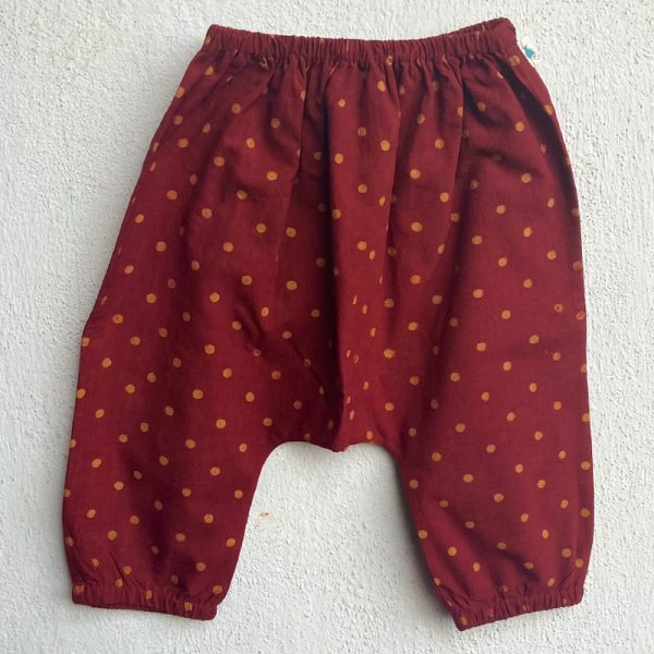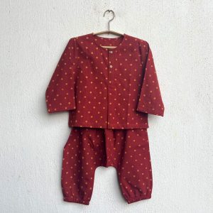 This gender-neutral gift set contains: 1 x kurta top: 100% organic cotton. Hand-block printed by traditional Ajrakh artisans in natural madder and haldi colours. Wooden buttons closures and flat seams for ease of wearing and fit.