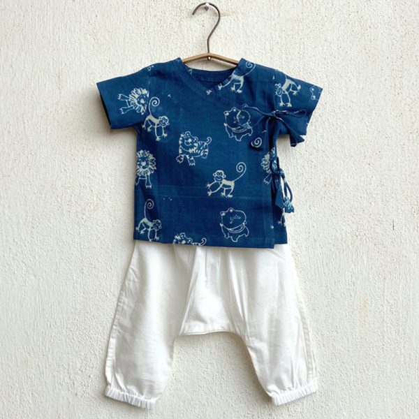 1 x angarkha top: 100% organic cotton hand-block printed by traditional Ajrakh artisans in naturally hypoallergenic indigo colour. Tie-up closures and flat seams for ease of wearing and fit.