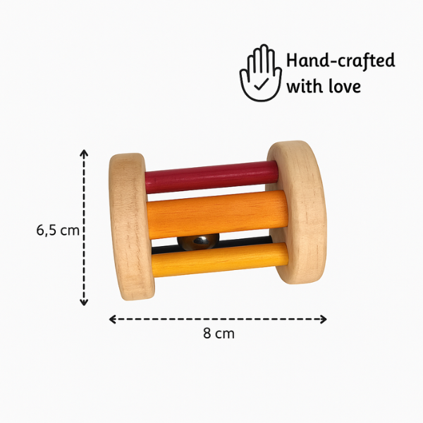 Our Wooden Roller Rattle (0+ months) is crafted to gently stimulate your baby’s senses through color, sound, and motion. The soft jingling chime keeps little ones engaged, while rolling the rattle encourages movement and curiosity. It beautifully complements other Montessori play essentials like wooden blocks and rainbow stackers, inspiring hands-on exploration and joyful learning.